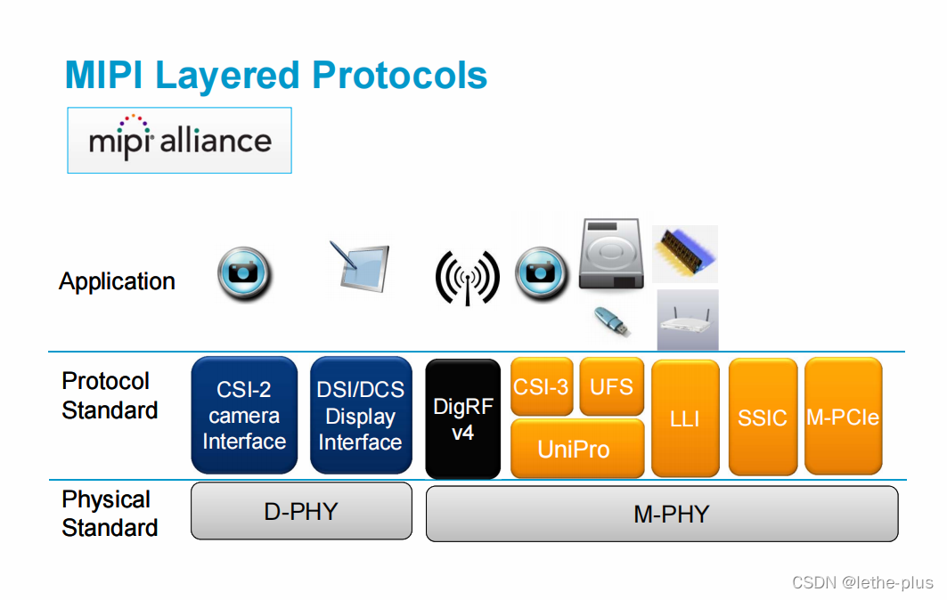 如图,MIPI是一个比较新的标准,其规范也在不断修改和改进,目前比较成熟的接口应用有DSI(显示接口)和CSI(摄像头接口)。CSI/DSI分别是指其承载的是针对Camera或Display应用,都有复杂的协议结构。