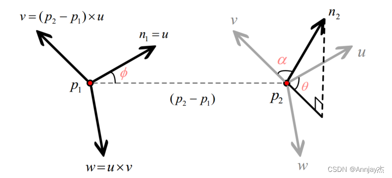 我这里说的三元素其实就是 [ α , ϕ , θ ] [\alpha,\phi,\theta] [α,ϕ,θ],其实还有一个元素 d d d,不过咱们一般都默认忽略了就。先解释一下: α \alpha α就是 p 2 p_{2} p2的法向量 n 2 n_{2} n2与坐标轴 v v v的夹角。 ϕ \phi ϕ就是 p 1 p_{1} p1的法向量 n 1 n_{1} n1与两个点连线之间的夹角。 θ \theta θ不好叙述,在此先不介绍,后面具体推到过程中各位就明白了。