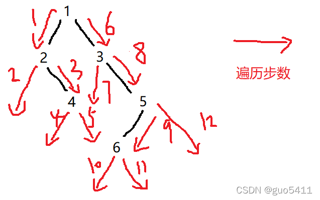 从根节点开始向其左孩子遍历每经过一个节点记录一下该节点的数值(只在第一次经过该节点时进行记录),当走到NULL时返回上一个节点,然后遍历其右孩子,如果右孩子存在记录其数值,再重复上面操作,如果不存在为NULL直接返回上一个节点再重复上面的操作.