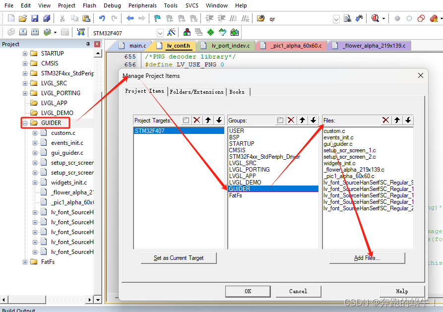 打开STM32的工程,新建GUIDER组,将GUI Guider工具导出程序(除了main.c外)全部加入到新建的GUIDER组目录下。