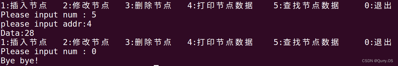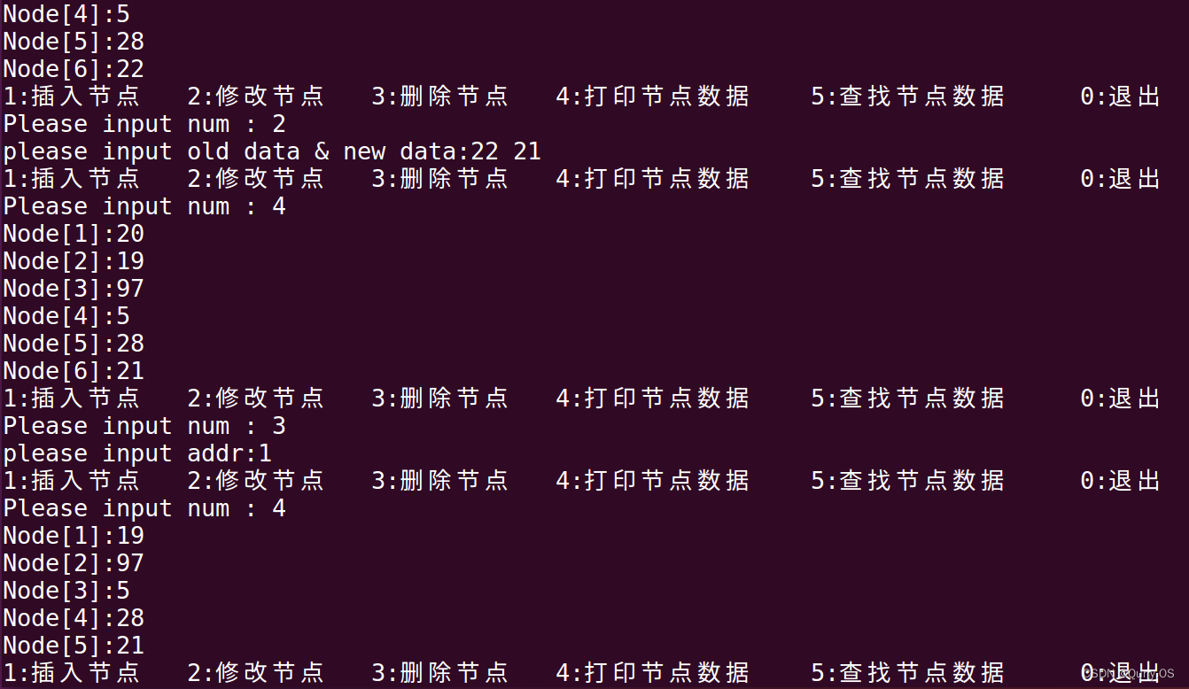 printf("1:插入节点 2:修改节点 3:删除节点 4:打印节点数据 5:查找节点数据 0:退出\n");