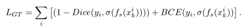 作者在目标函数中加入第三项,使预测的分割尽可能接近参考分割。它是dice损失(Dice)和二进制交叉熵(BCE)的总和,原因与第2.1节相同。作者称之为LGT: