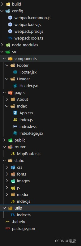 React + webpack 多页面应用 webpack生产配置 打包自动删除的插件调不好,索性自己写一个。使用webpack的多入口来打包后生成多页面。路由配置MapRouter.js。首页IndexPage.jsx。webpack 开发配置。打包自动删除 build。webpack公共配置。首页 index.js。