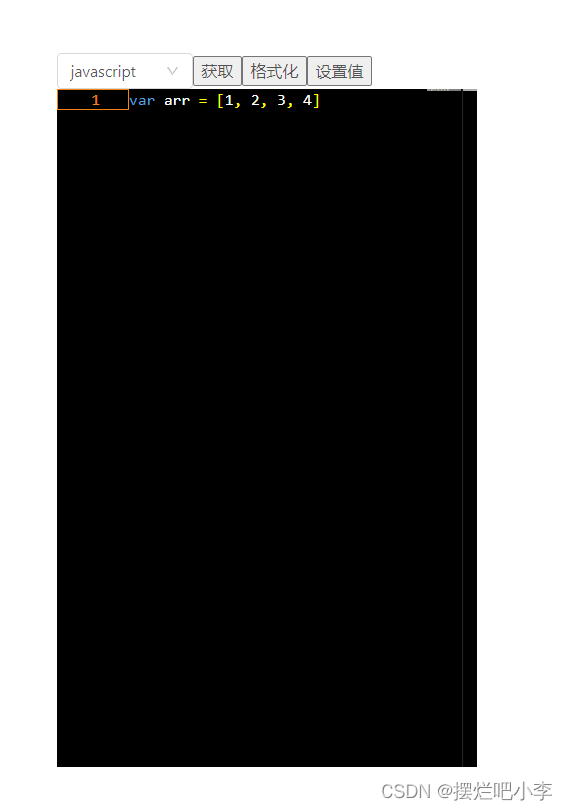 vue3使用monaco-editor组件 / 行号 取值: "on" | "off" | "relative" | "interval" | function。// 辅助功能支持 "auto" | "off" | "on"// 是否一直显示折叠 always | mouseover。// 折叠方式 auto | indentation。// 使用 - 创建 monacoEditor 对象。//是否只读 取值 true | false。// 行号最小字符 number。// 滚动完最后一行后再滚动一屏幕。//获取编辑器中的文本。
