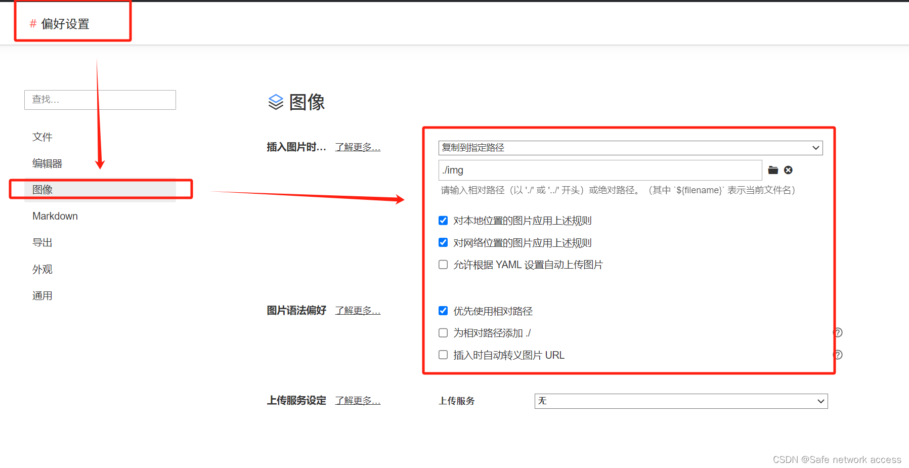 点击偏好设置-图像-插入图片时候选择复制到指定路径