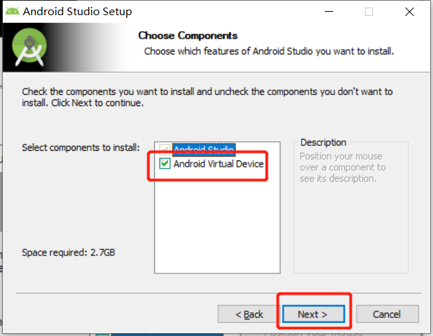 2. 这里主要是选择是否要一起安装Android Studio自带的模拟器,点击Next;(个人建议这里不勾选,直接使用第三方模拟器,具体原因和如何使用第三方模拟器可以参考我的另一篇相关博客 Android Studio连接自带模拟器失败怎么办?强烈建议使用第三方模拟器(含各类模拟器下载地址)_少糖加水的博客-CSDN博客)