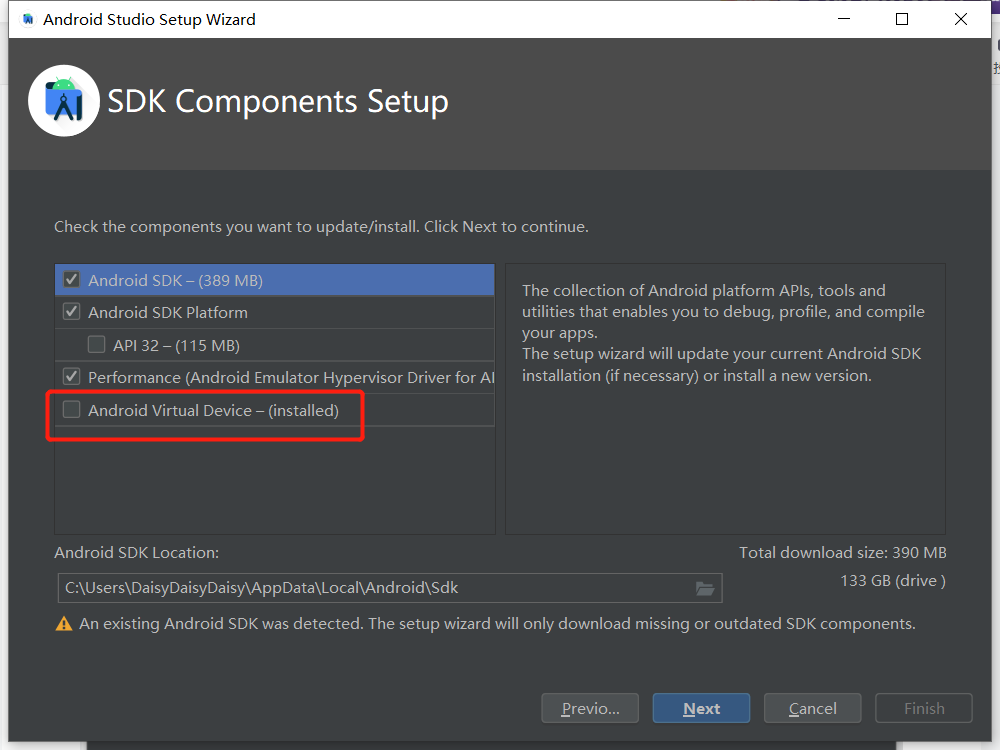 13. 这里跟前面一样,注意一下自己要不要安装Android Studio自带的模拟器,不要就不勾选,点击Next;