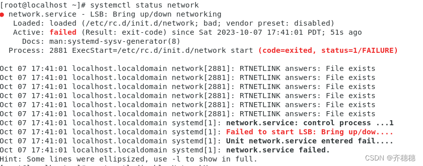 重启虚拟机后网络无法连接,查看网络状态显示网卡failed