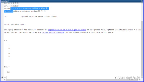 intcon=[1,2,3,4,5,6];%intcon为整数约束变量的位置。