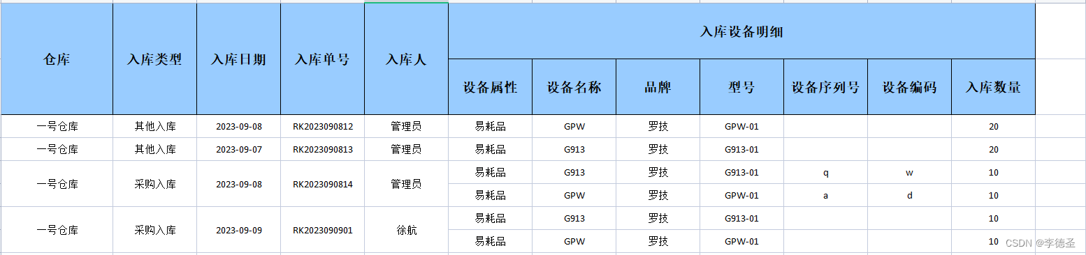 * 以下是一个多层标头,为了达到这种效果easyExcel会把入库设备明细该列进行合并,然后上面的单层标头为了和这个多层标头