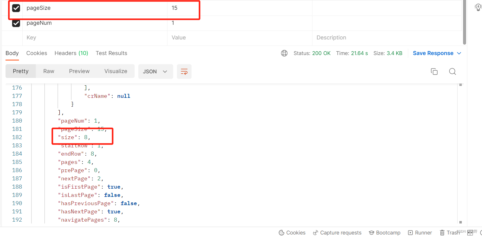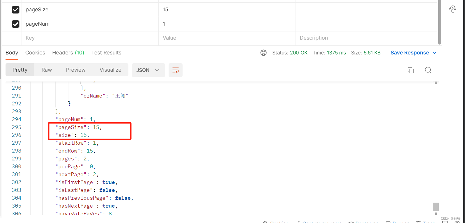 此时,再用postman测试。当传参pageSize为15的时候,便能够正确的返回15条记录了。
