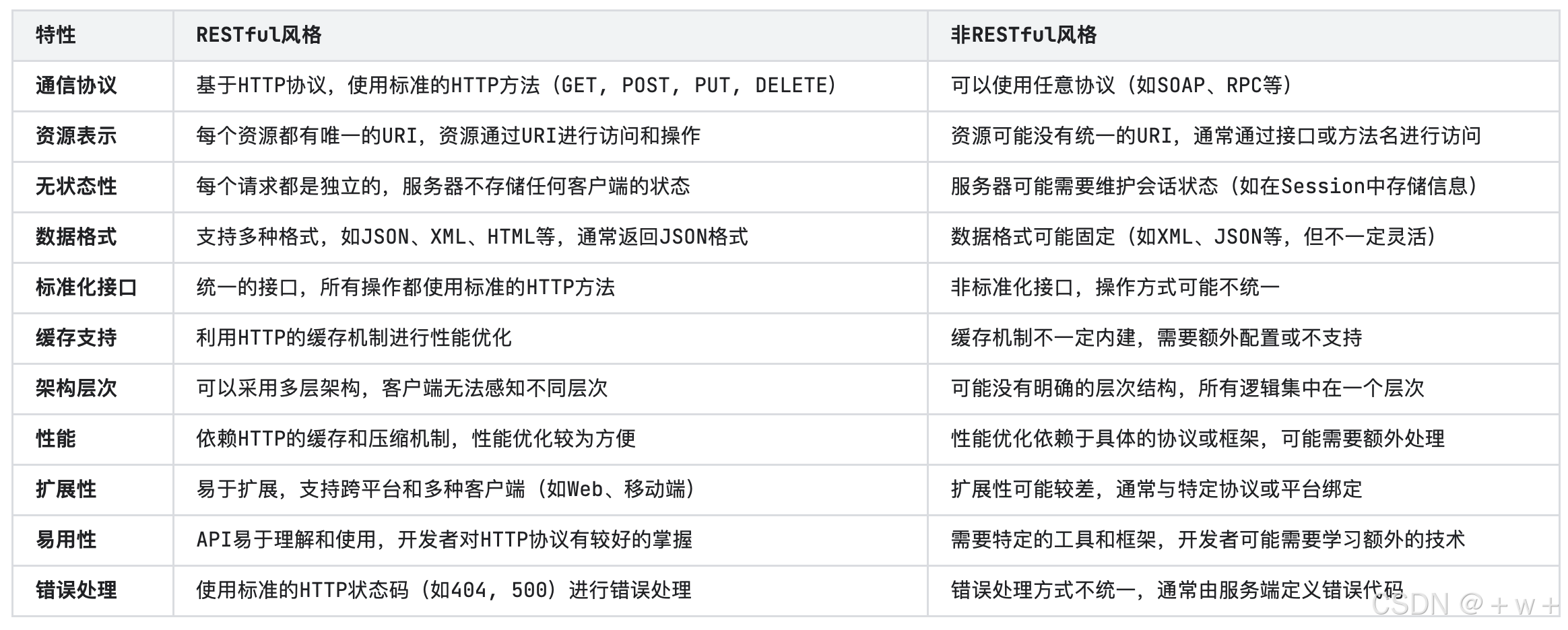 | POST | 创建资源,返回状态码201(Created)。示例:POST /users | 创建资源,结果可能不统一。示例:POST /createUser |