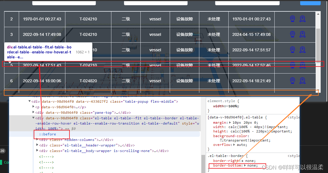 - 通过css可以看出伪元素::before就是这条多出来的横线,主要目的是作为el-table的下边框线。