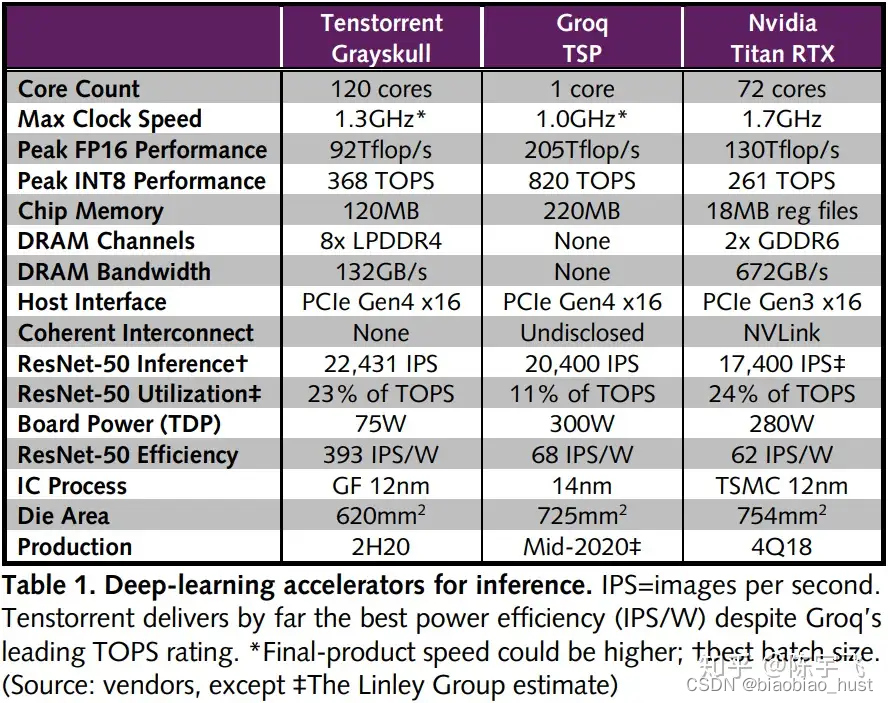 IPS/Watt 大概是这样的,可以看一下含光还是最高,但是Tenstorrent相对来说还是很好的。而且含光为了convolution我记得是有特殊的优化的,不单纯是systolic array。