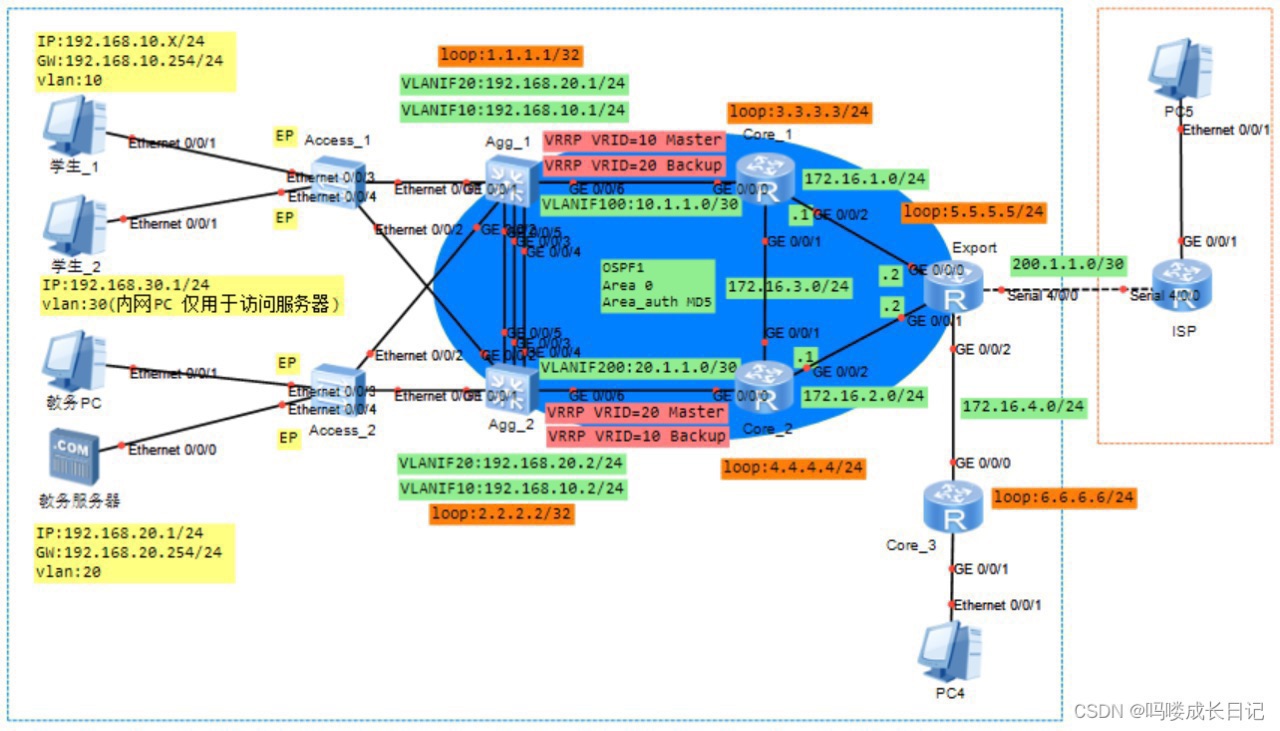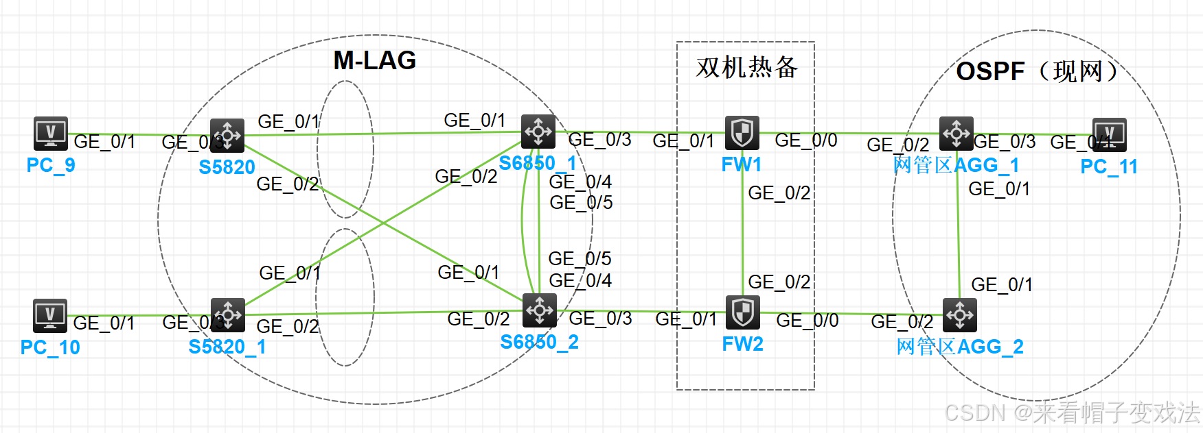 数通篇(五) - 企业网络扩容(真实项目案例-涉及M-LAG OSPF 双机热备) 某企业由于业务部门升级,需要进行网络扩容,需要在现网汇聚交换机上接入新区域,完成扩容对接现网;需新增两台防火墙、四台交换机实现其扩容需求。
