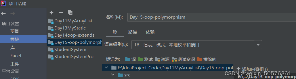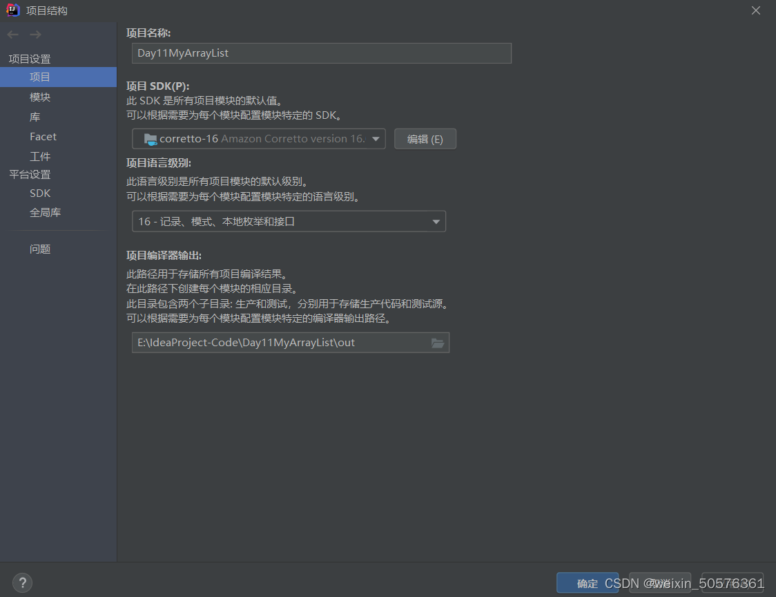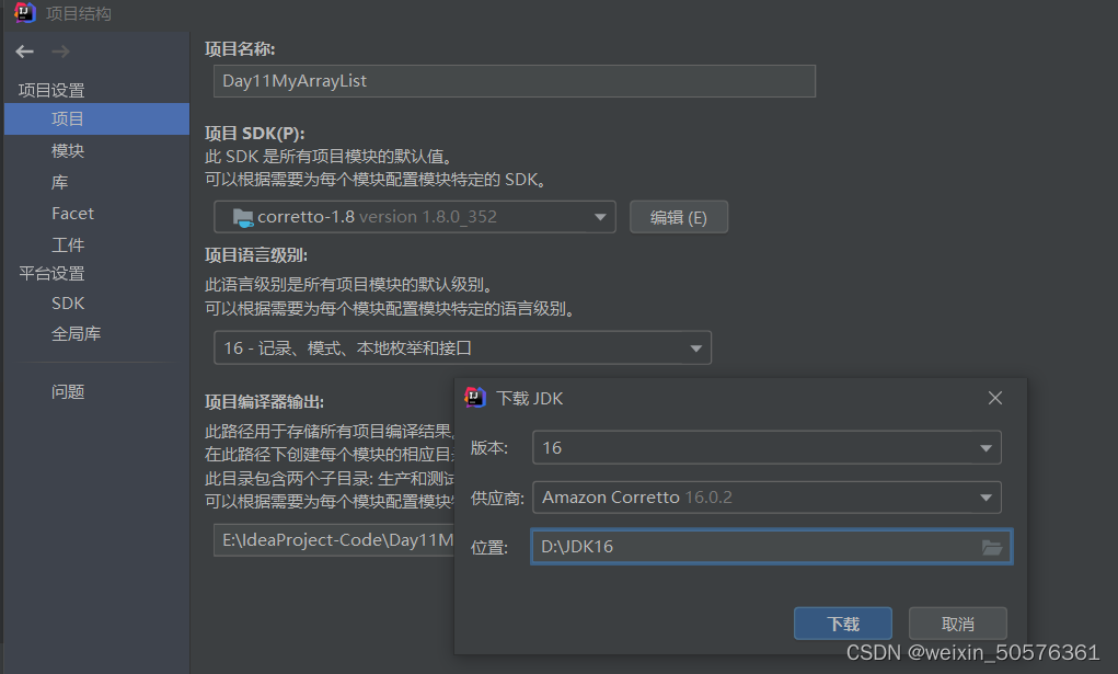 目录 问题描述 解决方案 问题描述 1.运行代码后IDEA控制台输出错误: 2.由于本次编译的代码语句instanceof得使用语言级别16 3.此时点开文件--项目结构--项目,查看发现项目的SDK和项目语言级别如下图 解决方案 4.经过查找发现是项目的SDK和项目语言级别不适配导致。下载16版本的JDK 5.更改后的配置 6.下载后点击右下角应用,运行成功。