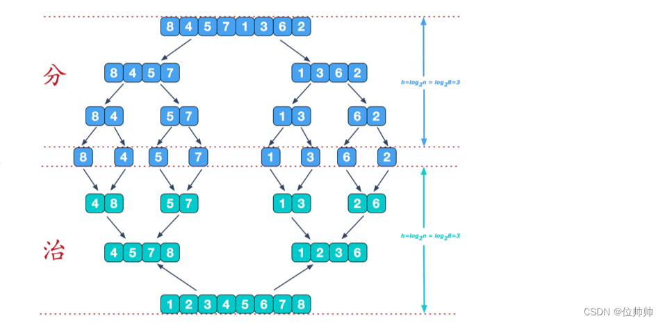 可以看到这种结构很像一棵完全二叉树,本文的归并排序我们采用递归去实现(也可采用迭代的方式去实现)。分阶段可以理解为就是递归拆分子序列的过程。