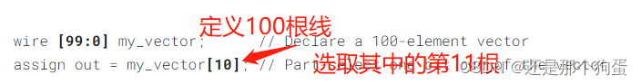 wire [7:0] w; // 8-bit wire reg [4:1] x; // 4-bit reg output reg [0:0] y; // 1-bit reg, 虽然只有一根,但是他任然是一个vector input wire [3:-2] z; // 6-bit wire input ,里面允许有负数 output [3:0] a; // 4-bit output wire,没有特殊声明的话,默认是wire类型 wire [0:7] b; // 8-bit wire ,其中b[0]是最高位