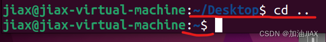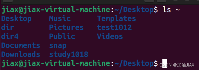 当使用了 cd ~ 命令,切换到 ~ 目录下,再使用 pwd 命令 (使系统显示我们当前所属目录的绝对路径),就可以看到,我们处于 /home/用户名 目录下。作者本人的用户名为jiax。