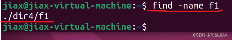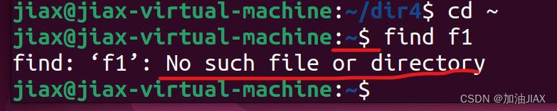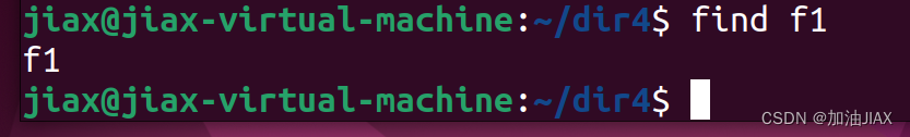 如果此时在 dir4目录文件所在目录 /home/jiax 目录下,直接使用 find f1 命令查找f1文件,会显示,无此文件。
