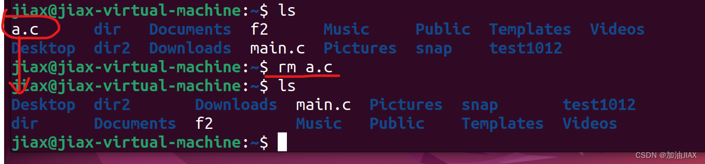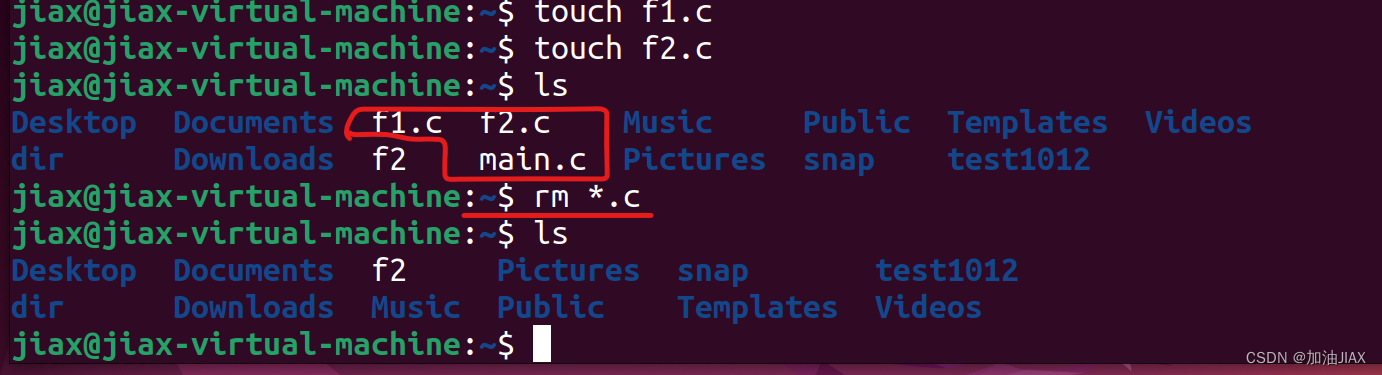 在/home/jiax 目录下,目前只剩下这些文件,其他一些普通文件都在前面的操作中被删除了。