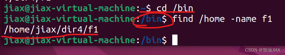 此时,在 /home/jiax 目录就可以直接找到 f1文件,系统就会显示其相对于/home/jiax目录的相对路径。