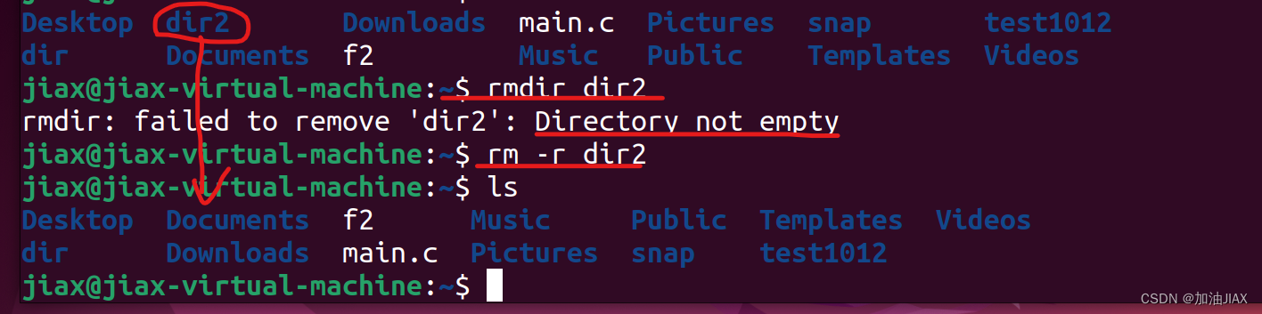 对于非空目录,我们就可以使用 rm -r +目录名 ,进行强制删除。使用rmdir的话,会显示警告,并删除失败。