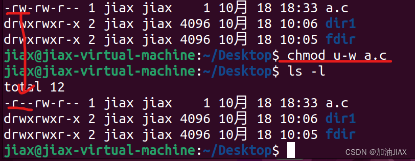 u 表属主 g 同组人 o 其他人 a 所有人 “+”表示增加权限 “-”表示去掉权限