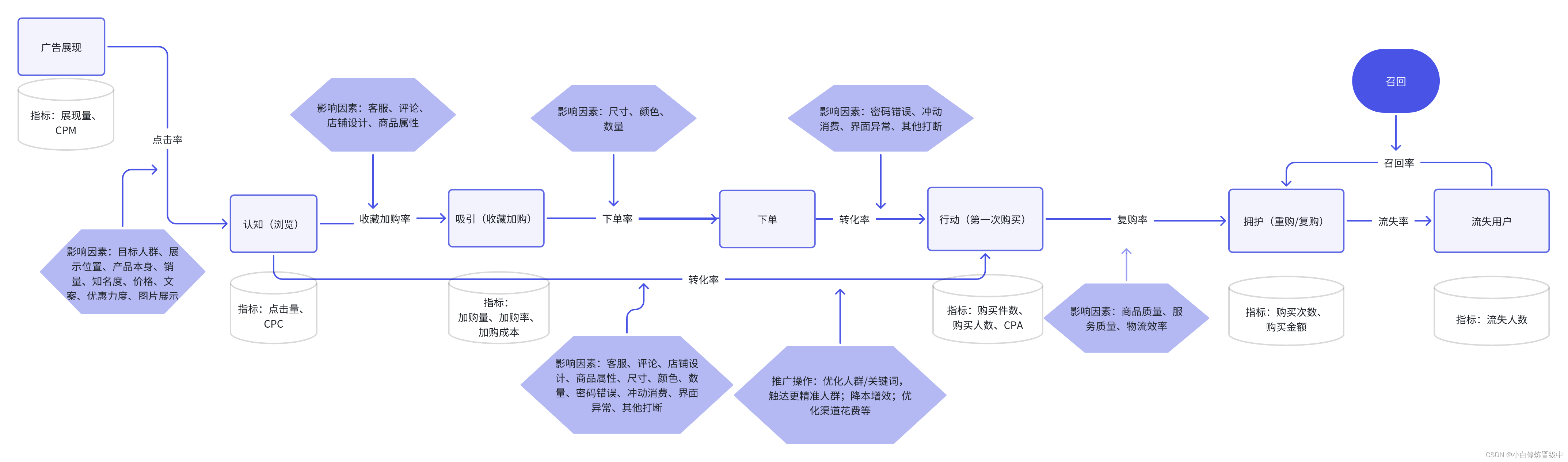 《广告数据定量分析》第3版读书笔记之理论/概论 每个阶段搜索“旅游双肩包”组成的消费者有所不同,这些人群里购买意愿强度也是随机性的,得到的效果如转化率是存在一定偏差的(偏差多大怎么判断后面学习一下),各指标存在小波动是正常的,判断调整后效果好坏环比或者同比波动需要明显一点;一般来说,广告数据是相对稳定的,如果出现异常值,一般是受到大盘波动、竞店新品上新等原因调整推广投放力度的影响;(2)测试逻辑:保持变量基本不变的情况,少量调整变量,累计数据,评估调整效果不断调整测试;(2)将数据处理为需要的指标如转化率、roi等进行分析其投放效果;