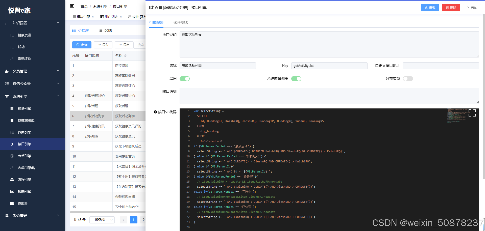 悦肾e家小程序的后台通过使用Microi吾码低代码平台的表单引擎、模块引擎和接口引擎等,能够快速构建后台的业务逻辑和模块,大量减少了代码的工作量。并且平台前后端打通,可以轻松地与前端进行集成。