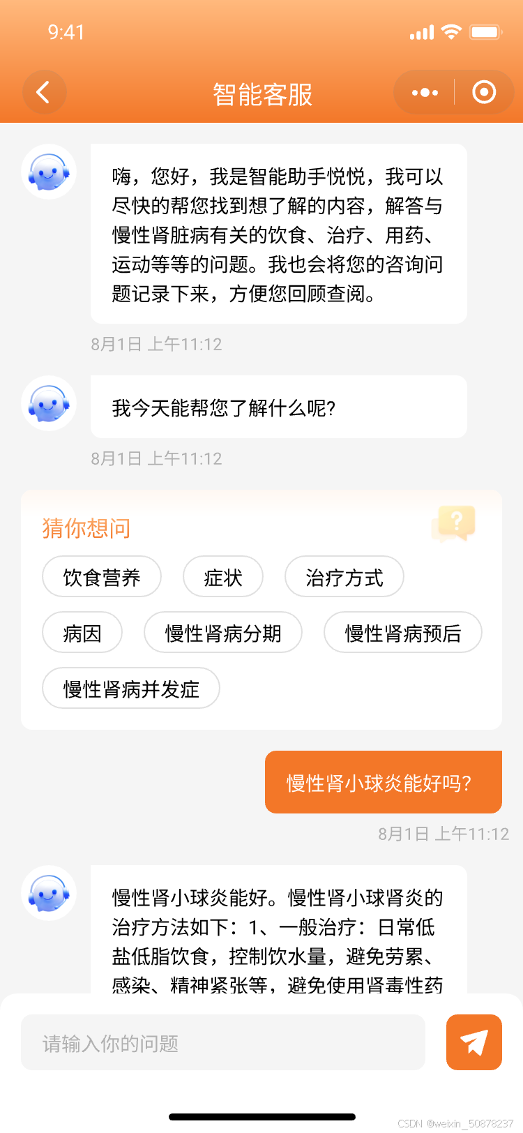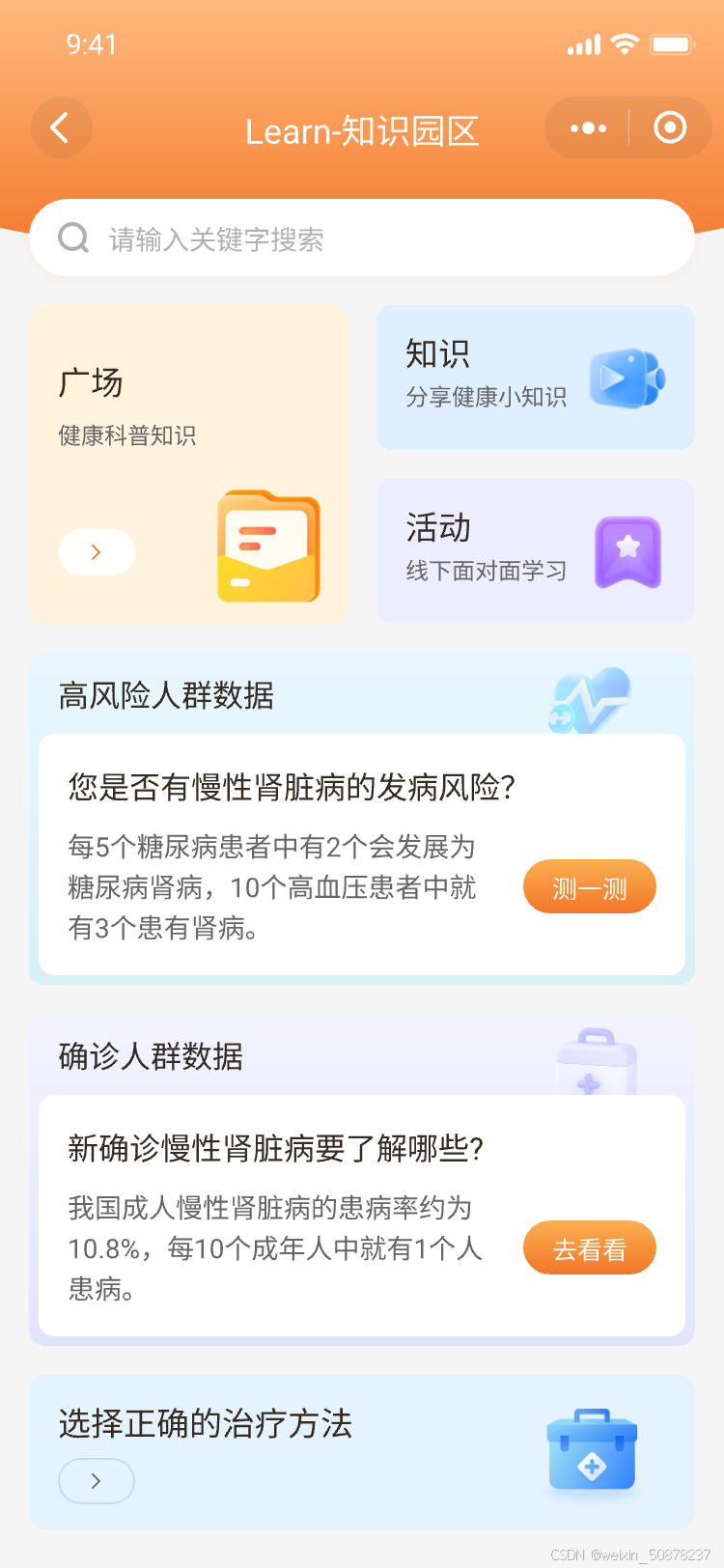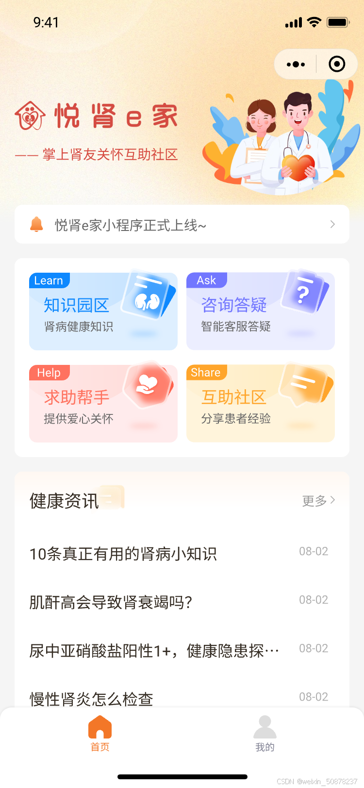 Microi吾码又一佳作 悦肾e家;悦肾e家是一个专注于肾友的平台,提供健康知识相关的文章、在线计算、自检问卷、智能客服、病历管理等功能。用户可以通过折线图查看健康指标变化,搜索平台的医疗资源,并参与社区话题和线下活动学习互动,帮助提高肾脏健康意识和管理水平