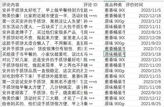 本次选择了京东上面的一个是手抓饼商品的评论,我爬取了2千多条,数据如下: