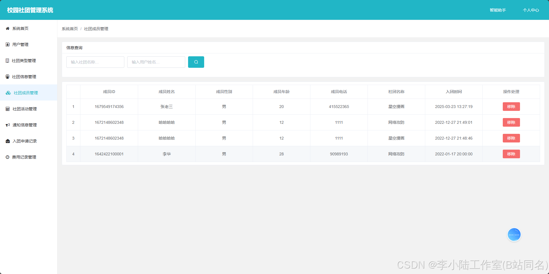 社团成员管理:实现对社团的成员查询和删除功能。