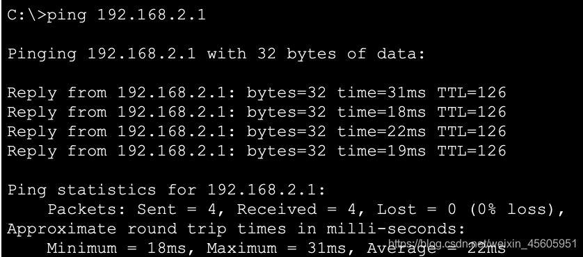 在PC0的cmd上与PC1ping: