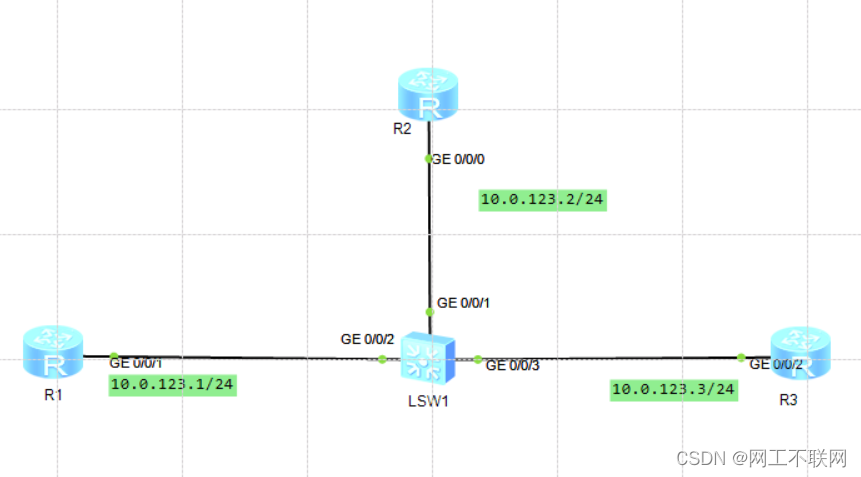 OSPF基础实验之OSPF单区域一、OSPF的LSA常用类型1类LSA:router -LSA,本区域内传播 router-id产生在单个区域中分别产生一条1类LSA,若存在MA网络,1类LSA不完整,需要配合二类 LSA生成路由信息以及拓扑信息。2类LSA ,network LSA ,网络LSA3类LSA :summary LSA 汇总LSA5类LSA: 外部LSA4类LSA: summary ASBR LSA7类LSA : NSSA LSA二、OSPF单区域1.实验拓扑图