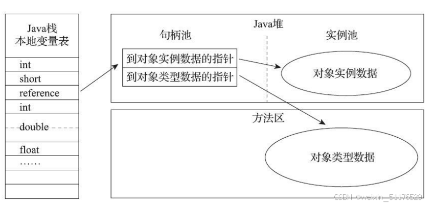 使用句柄访问,Java堆中将可能会划分出一块内存来作为句柄池,reference中存储的就 是对象的句柄地址