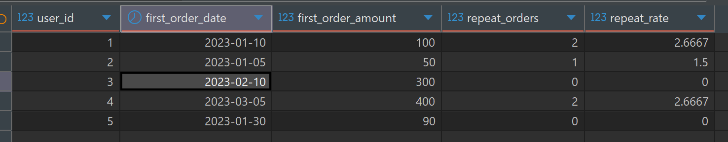 user_id,first_order_date,first_order_amount,repeat_orders,repeat_rate