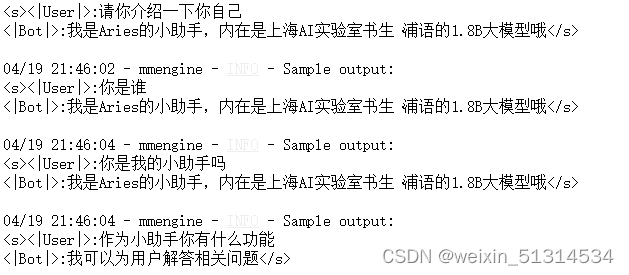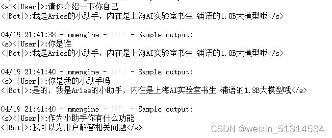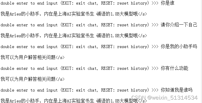 在 XTuner 中也直接的提供了一套基于 transformers 的对话代码,让我们可以直接在终端与 Huggingface 格式的模型进行对话操作。我们只需要准备我们刚刚转换好的模型路径并选择对应的提示词模版(prompt-template)即可进行对话。假如 prompt-template 选择有误,很有可能导致模型无法正确的进行回复。