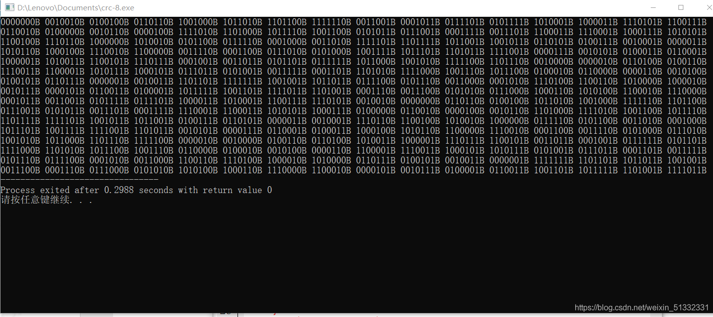 2021-08-10 CRC-8-16校验C语言实现-原数据(0-256)除数x7+x4+1(除数不定可自行修改)输出结果为二进制形式C语言-代码如下#include<stdio.h>#include<string.h>#include<math.h>#define N 40void DTOB(int n,char str1[]);void B0(char str1[]);int main(void){ int n,i,k,l,m; char str1[16]={0}