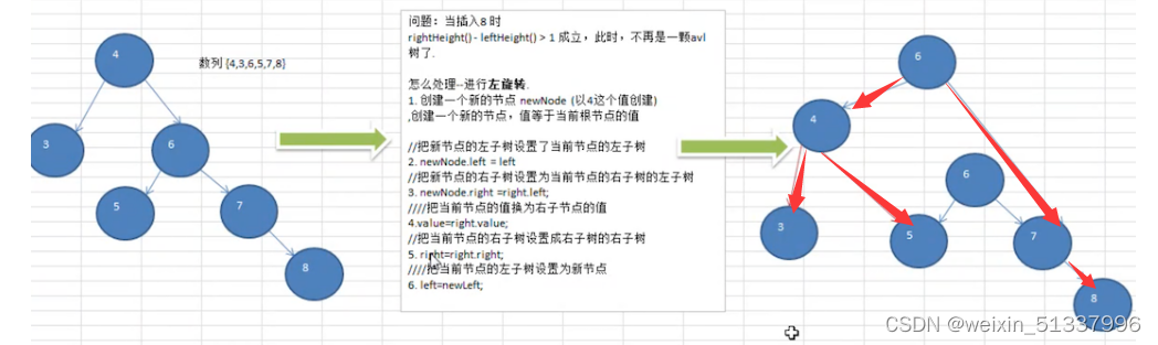 平衡二叉树是通过二叉排序树实现的,所以过程是在构建二叉平衡树的过程中进行AVL树的构建,一旦发现左子树于右子树的差值大于1,此时就需要进行左旋或者右旋让其变为一颗平衡二叉树。
