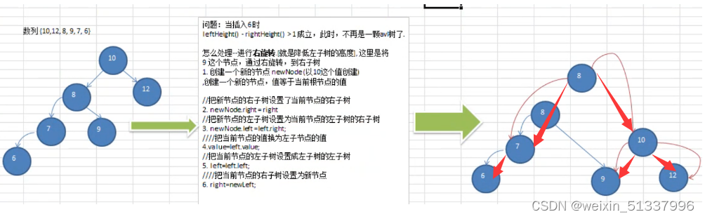 <span style="background-color:#333333">1.新建一个节点newNode 让其值等于root节点 2.让newNode节点的right指向root节点的right newNode节点的left指向root左节点的rught 3.让root节点的值等于root节点的左节点值 4.让root节点的left指向root左节点的left 5. 让root节点的right指向newNode /** * 右旋 * 左子树高度减去右子树高度大于一 */ public void rightRotate(){ // 首先创建一个新的节点 将当前root节点赋值给新节点 averageNode averageNode = new averageNode(root.getData()); // 然后将新创建的节点的right指向root节点的右节点 averageNode.setRight(root.getRight()); // 接着将root节点的值变为root左节点的值 root.setData(root.getLeft().getData()); // 将root节点的left指向root左节点的left root.setLeft(root.getLeft().getLeft()); // root节点的right指向新节点 root.setRight(averageNode); // 新节点的left指向root左节点的right averageNode.setLeft(root.getLeft().getRight()); } </span>左旋右旋判断中重要的是判断树的高度: