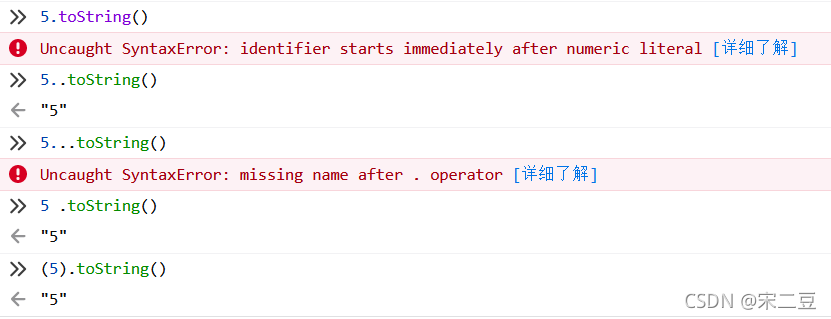 5.toString()5..toString()5...toString()5 .toString()(5).toString()运行结果如下:解析结果如下:出现上述结果是因为运算符优先级的问题,点和括号的优先级是最高的,结合方向从左到右。5.toString()会被浏览器解析成(5.)toString()报错。5..toString()会被浏览器解析成(5.).toString()。5...toString()会被浏览器解析成(5.)..toString()报错。..