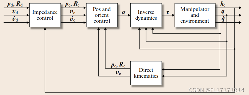 通过将运动控制与阻抗控制分离,解决方法如下。运动控制动作有目的地做到僵硬,以增强干扰抑制,但它不是确保跟踪所需的末端执行器的位置和方向,而是确保了对由阻抗控制动作产生的参考位置和方向的跟踪。换句话说,所需的位置和方向以及测量的接触扳手被输入到阻抗方程中,阻抗方程通过适当的积分产生作为运动控制参考的位置和方向。