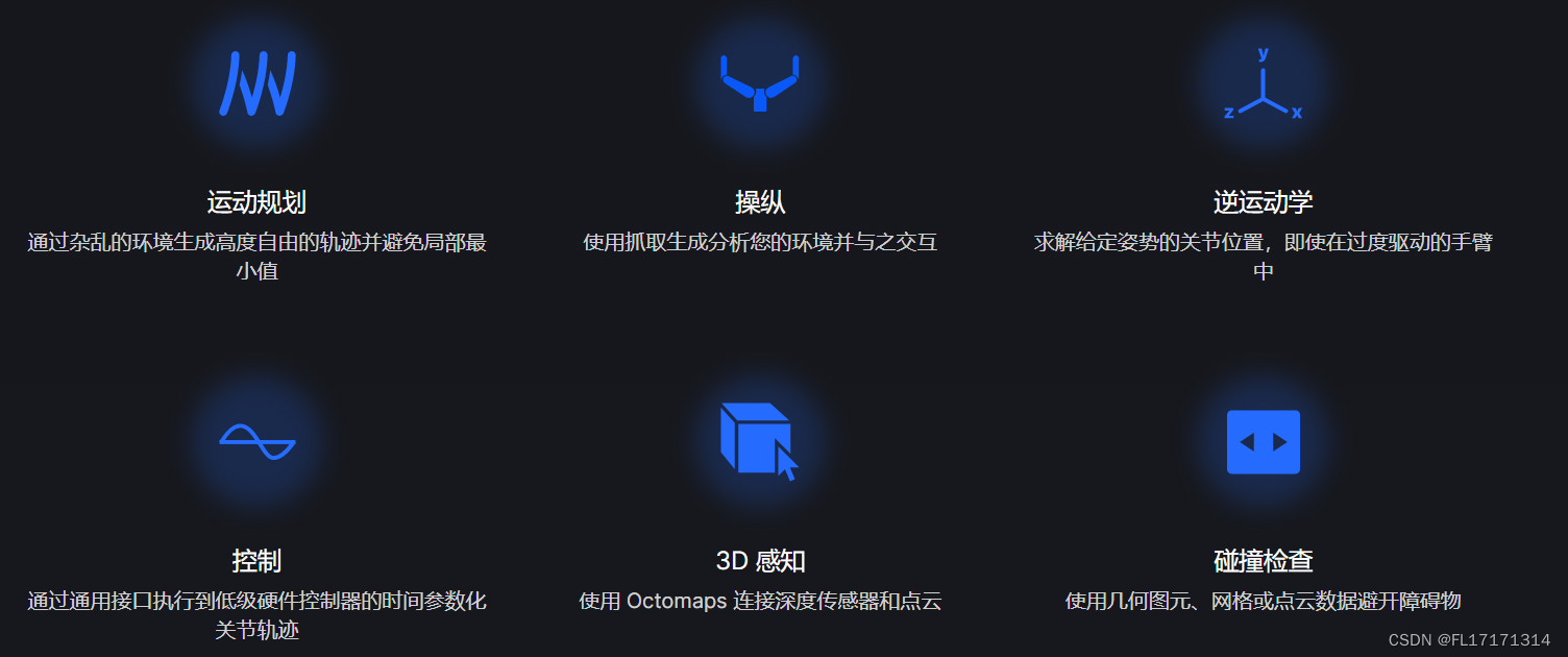概念:MoveIt是使用最广泛的操作软件,已经在100多个机器人上使用。它提供了一个易于使用的机器人平台,用于开发高级应用程序,评估新设计和构建工业、商业、研发和其他领域的集成产品。