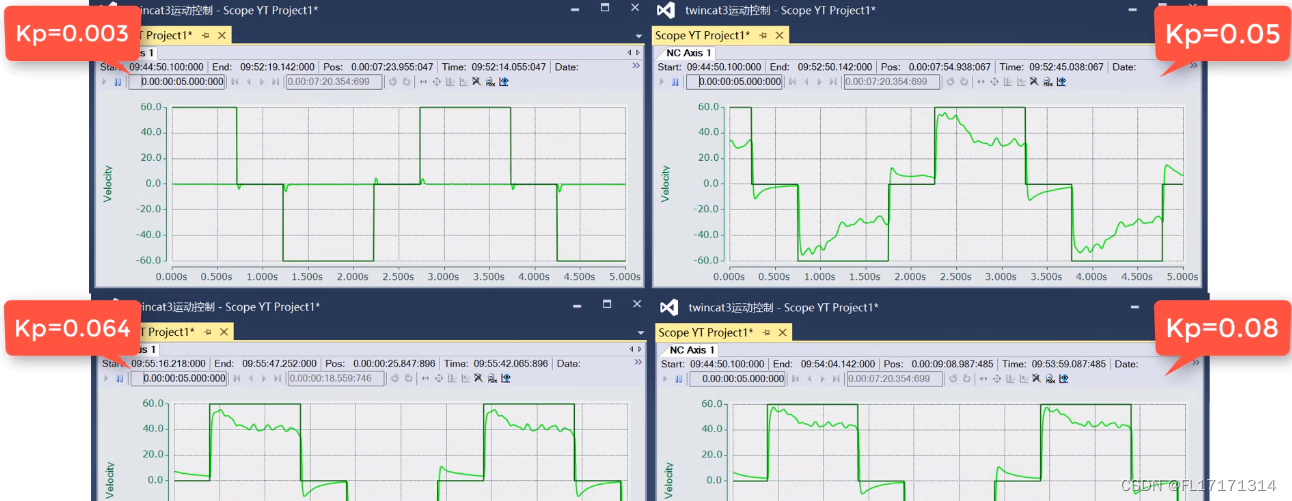 先调整增益,波形在刚好超调一点,但是未出现过大的震荡,即可。然后调节积分,