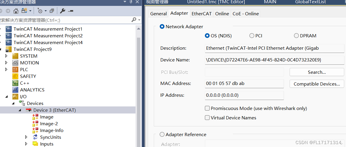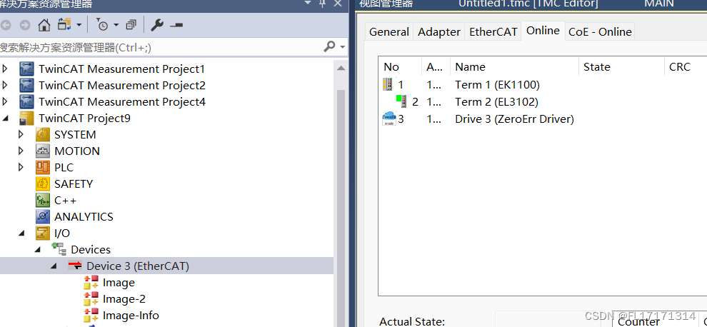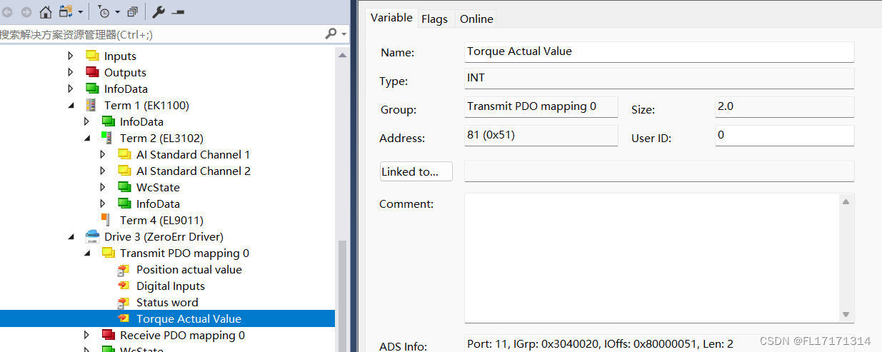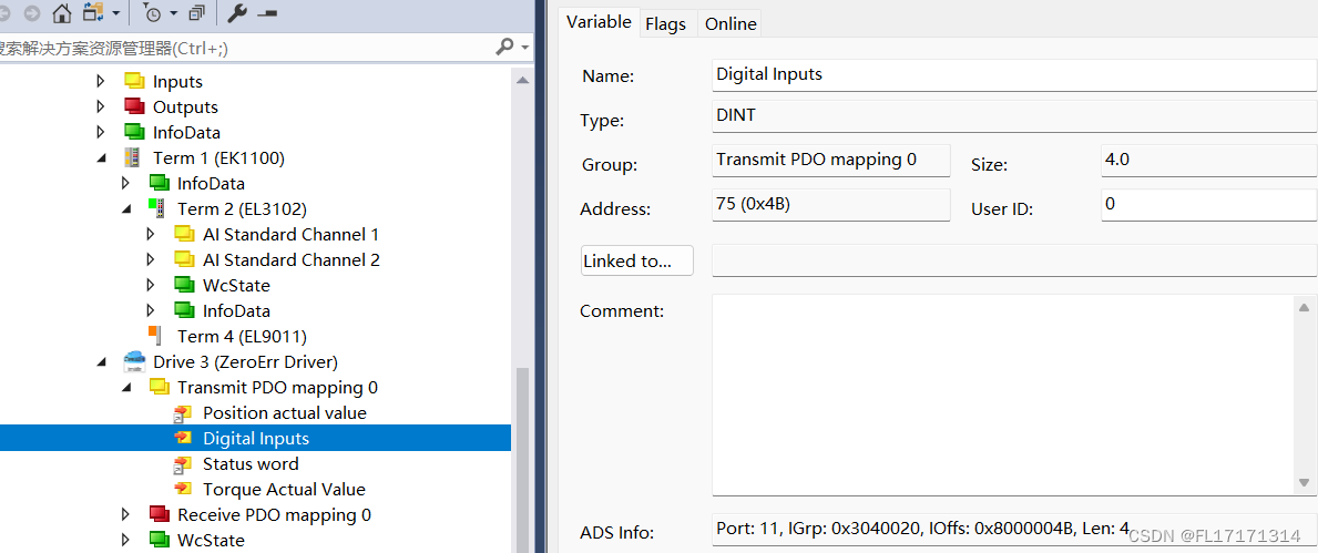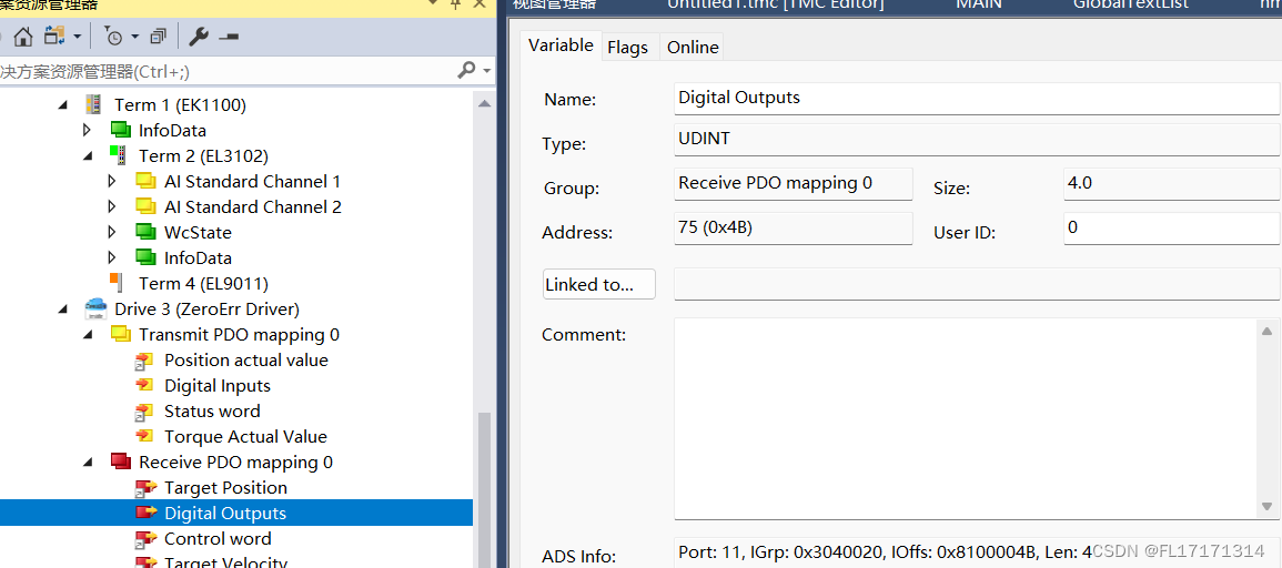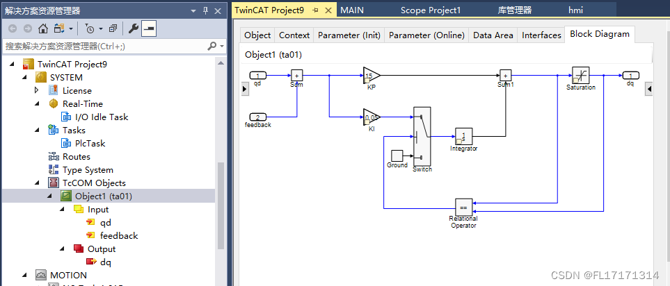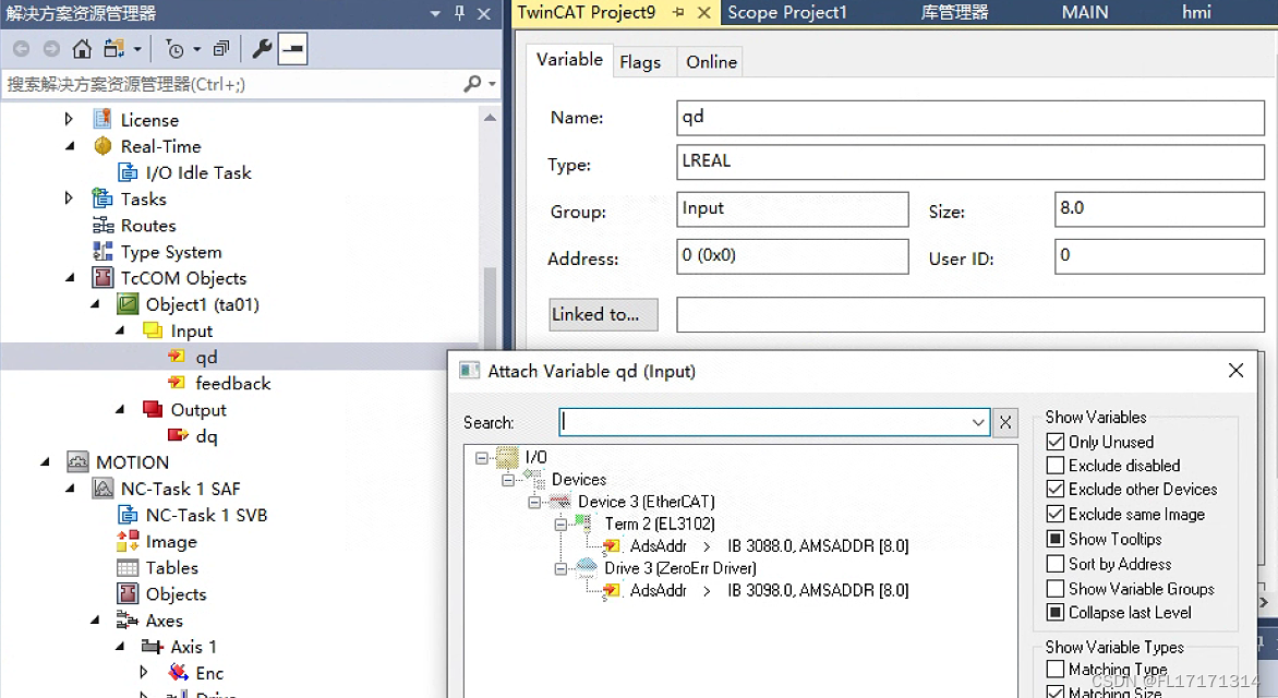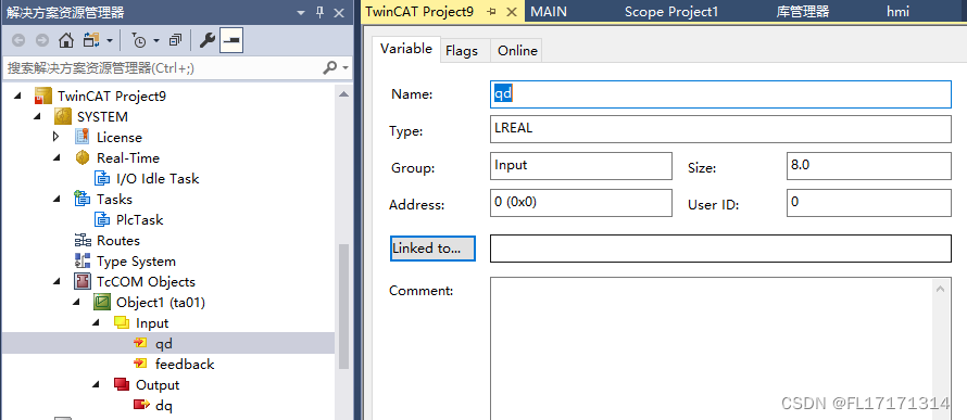 (3)添加好后我们可以发现 TcCOM Objects 下出现 matlab 生成的 Module,并且 3 个变量出现在 IO 位置,方便