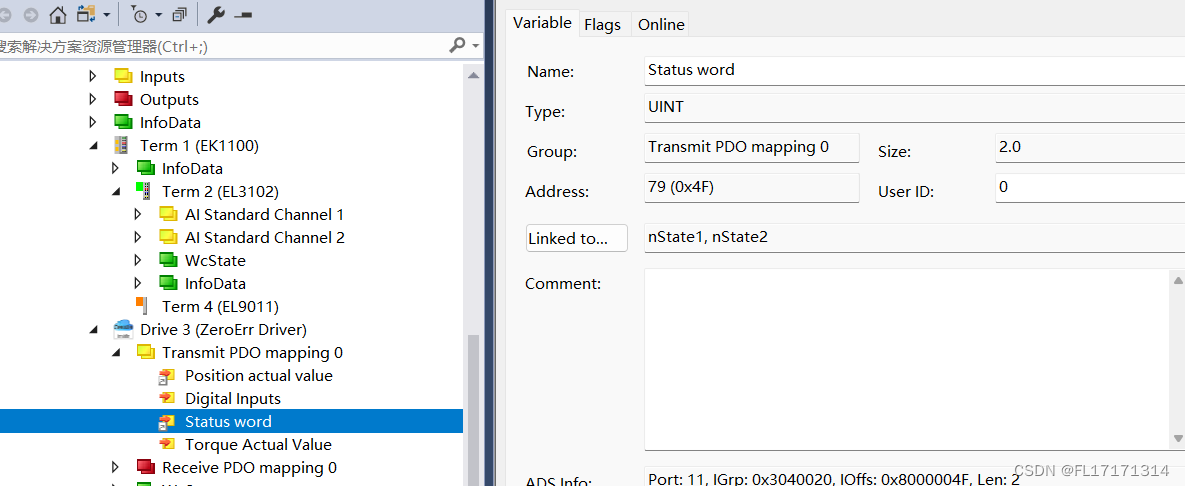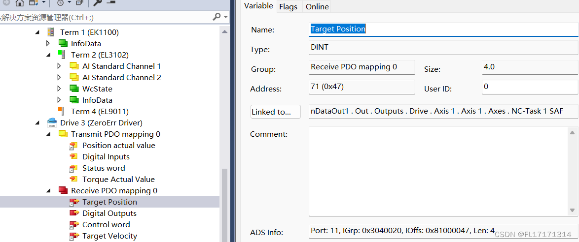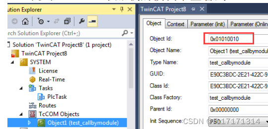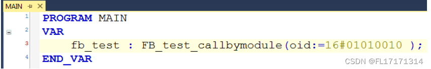 3. 开始写程序,首先对于模块接口功能块进行变量声明,在 oid 中输 入 TcCOM 中模块的 Object Id