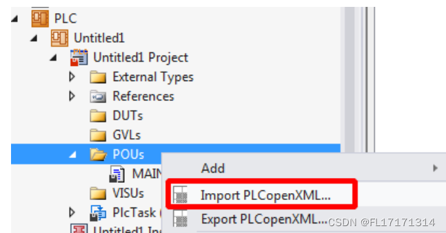 2. PLC 项目,右键 POUs 点击 Import PLCopenXM