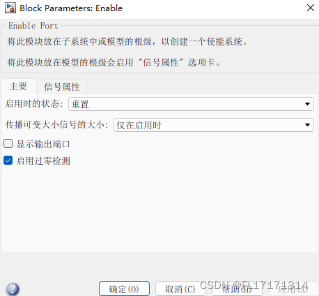 打开子系统模块,然后打开 Enable 端口模块的参数对话框。从启用时的状态下拉列表中,选择: